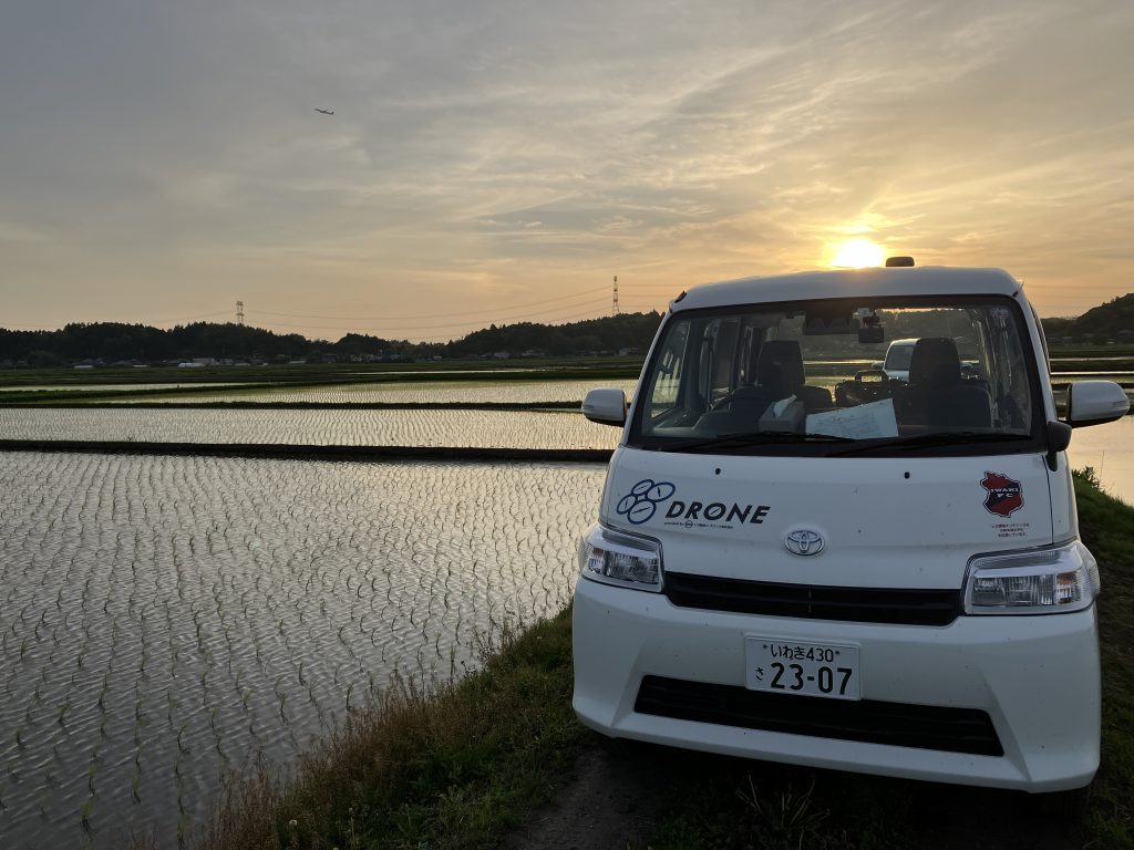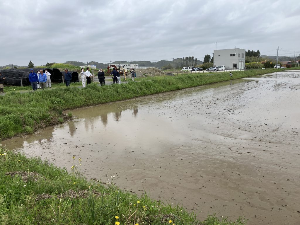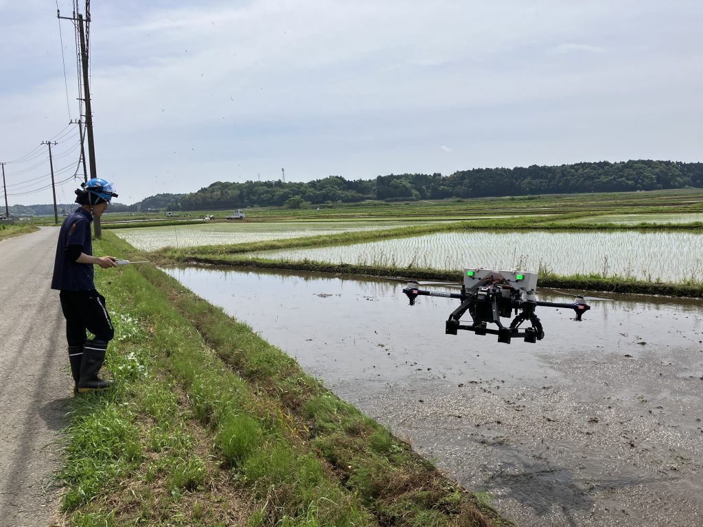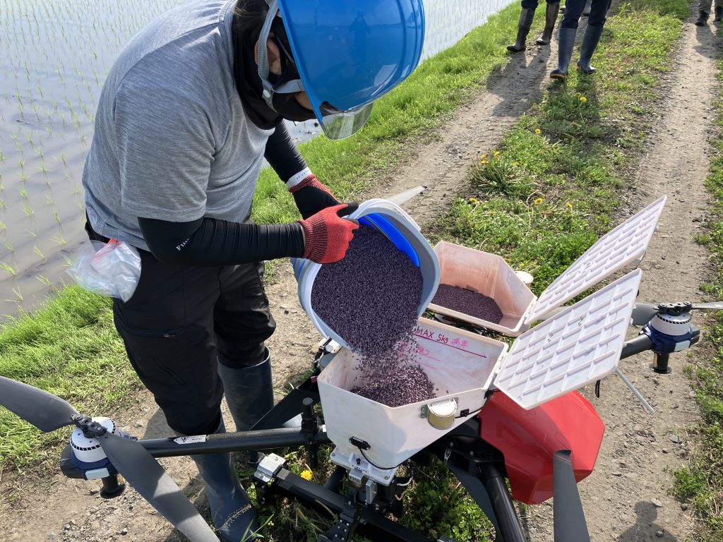 ドローンを低空飛行させて30センチおきに約1センチの深さに種をまく「直播」の作業は今シーズン終わりました。直播は直接種を撒くので苗を育てたり運んだりする必要がなく農作業を軽減できます。広さ1,000㎡の水田の田植えは、田植え機を使うと約30分かかりますが、ドローンによる直播では10分から15分ほどとなります。