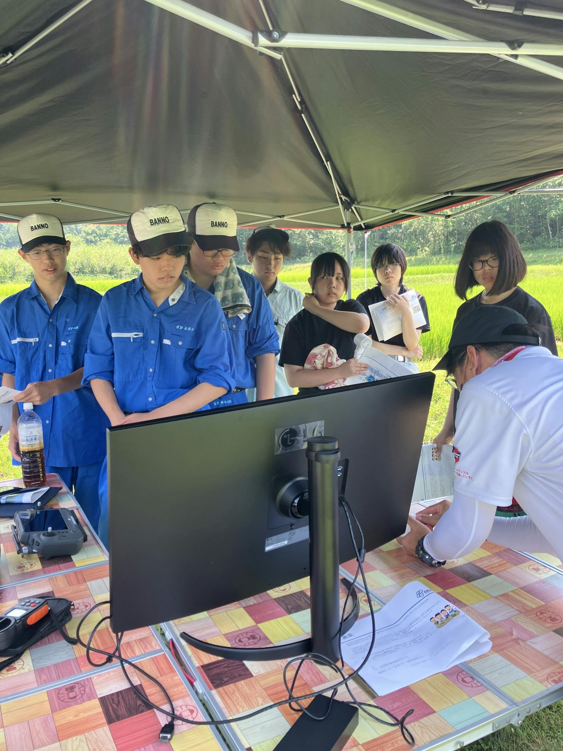 今回は10名の生徒さんが参加。まずは1時間の座学で「ドローンとはどういうものなのか」という基礎から農業におけるドローンの役割、スマート農業についての講義を行い、2時間かけて薬剤散布の見学へ。生徒たちも真剣な眼差しで取り組んでいました。