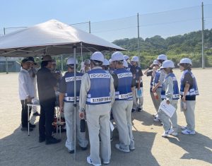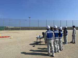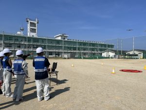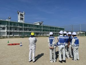 操縦訓練では校庭へ移動しドローンの組み立て方から実施。3班に分かれて起動・離陸から着陸までカラーコーンを目印にドローンを操作しました。