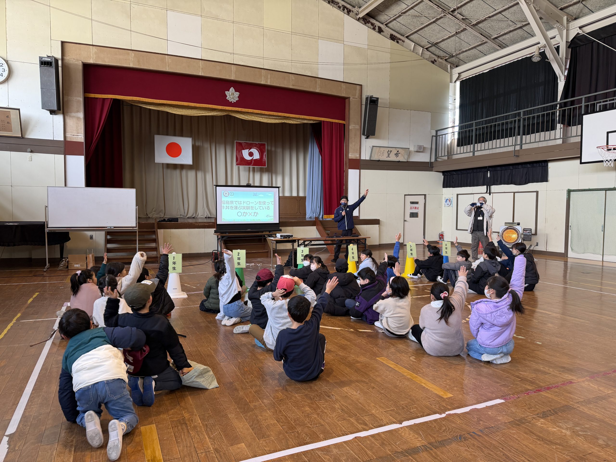 まずは、ドローンの仕組みや活用事例、注意事項などについて学習を行い、その後にはドローンクイズ大会も実施。